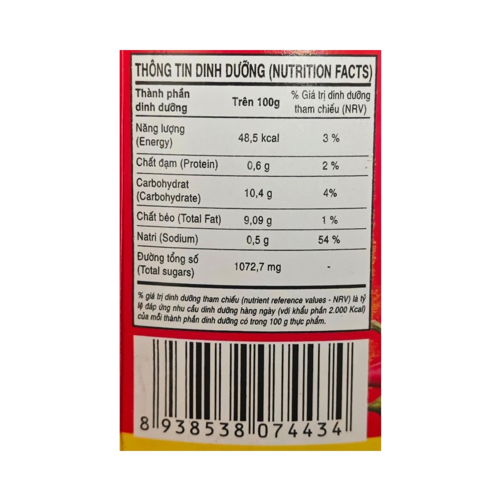 Thành phần: Nước, tinh bột biến tính, muối, ớt tươi (3%), tỏi, chất làm dày (INS 1422), chất điều chỉnh độ axit (INS 260, INS 330), chất bảo quản, chất điều vị và hương liệu tổng hợp.